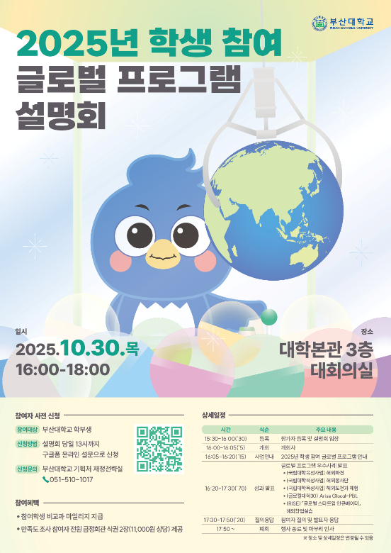 2. 학생들의 글로벌 역량 강화 및 국제교류 활성화를 위한「2025년 학생 참여 글로벌 프로그램 설명회」를 다음과 같이 개최하오니, 각 단과대학 및 학과(부)에서는 소속 학생들에게 안내하여 주시기 바랍니다.