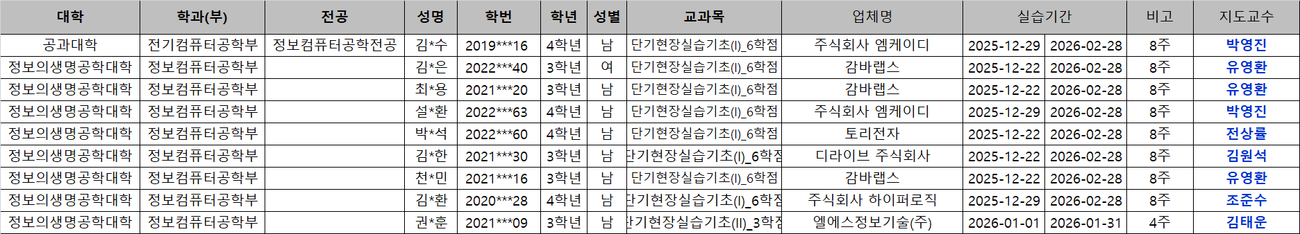 2025학년도 겨울계절학기 현장실습 지도교수를 아래와 같이 배정합니다.