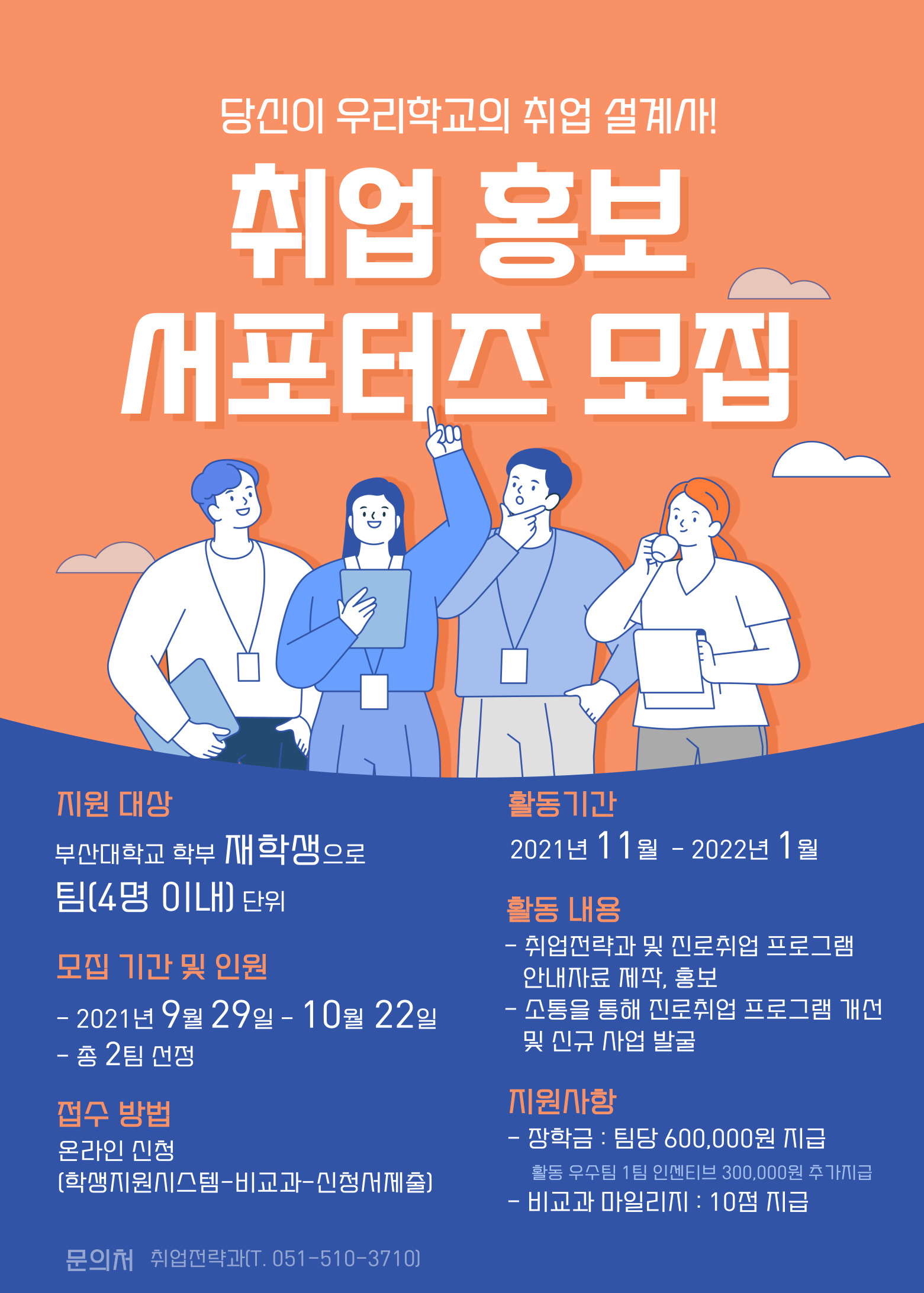 ? 모집대상: 학과(부) 재학생으로 ‘팀(4인 이내)’ 단위 신청 ※ 휴학생, 졸업유예생 제외 ? 활동내용: 취업전략과 및 취업전략과 프로그램 홍보물 제작 등 ? 활동기간: 2021. 11월 ~ 2022. 1월【3개월】 ? 신청방법: 학생지원시스템 → 비교과 → 참가신청 → 취업 홍보 서포터즈 선택, 참가 신청서 제출 ? 참가혜택: 장학금(팀, 600천원) 및 비교과 마일리지(10점) 지급 ? 기타 세부사항: 안내문[붙임1] 확인 | ||
