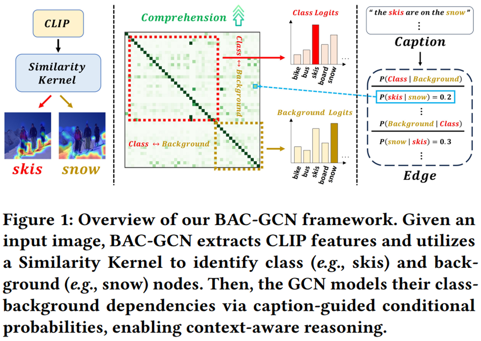 연구요약: Multi-label classification has recently demonstrated promising performance through CLIP-based unsupervised learning. However, existing CLIP-based approaches primarily focus on x-object-centric features, which limits their ability to capture rich contextual dependencies between x-objects and their surrounding scenes. In addition, the vision transformer architecture of CLIP exhibits a bias toward the most prominent x-object, often failing to recognize small or less conspicuous x-objects precisely. To address these limitations, we propose Background-Aware CLIP-GCN (BAC-GCN), a novel framework that explicitly models class-background interactions and is designed to capture fine-grained visual patterns of small x-objects effectively. BAC-GCN is composed of three key components: (i) a Similarity Kernel that extracts patch-level local features for each category (i.e., class and background), (ii) a CLIP-GCN that captures relational dependencies between local-global and class-background features, and (iii) a Re-Training for Small x-objects (ReSO) strategy that enhances the representation of small and hard-to-learn x-objects by learning their distinctive visual characteristics. Therefore, our method facilitates a deeper understanding of complex visual contexts, enabling the model to make decisions by leveraging diverse visual cues and their contextual relationships. Extensive experiments demonstrate that BAC-GCN achieves state-of-the-art performance on three benchmark multi-label datasets: VOC07, COCO, and NUS, validating the effectiveness of our approach. The project page is available at: https://github.com/yonghyeonjo46/BAC-GCN