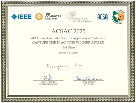권동현 교수 연구실(CSLab) 소속 김경환 학부연구생이 지난 12월 8일부터 12일까지 미국 하와이에서 개최된 컴퓨터 보안 분야의 우수 국제 학술대회인 “Annual Computer Security Applications Conference (ACSAC) 2025”의 부대 행사인 Student Capture The Flag (CTF) 해킹대회에서 2위(Second Place)를 수상하는 쾌거를 이뤘다.