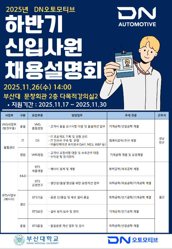 DN오토모티브 2025 하반기 채용설명회 일정을 아래와 같이 알려드리니, 많은 학생들이 참여할 수 있도록 안내하여 주시기 바랍니다.