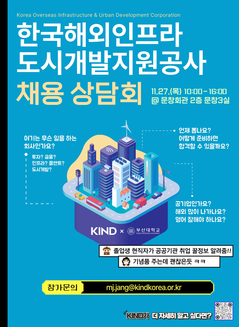 한국해외인프라도시개발지원공사(KIND) 2025 하반기 채용상담회 일정을 아래와 같이 알려드리니, 많은 학생들이 참여할 수 있도록 안내하여 주시기 바랍니다.