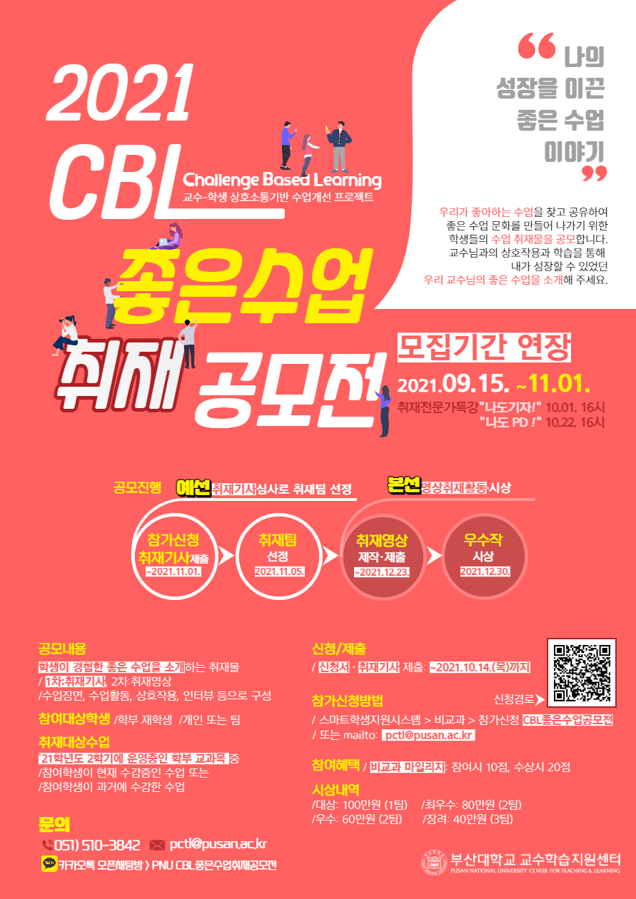 2021학년도 CBL좋은수업 취재 공모전의 신청접수 기간 및 전체 일정을 변경하여 운영하고자 하오니, 많은 학생들의 참여 바랍니다.